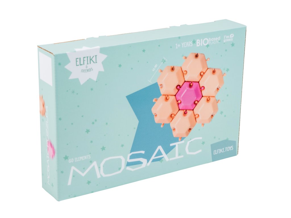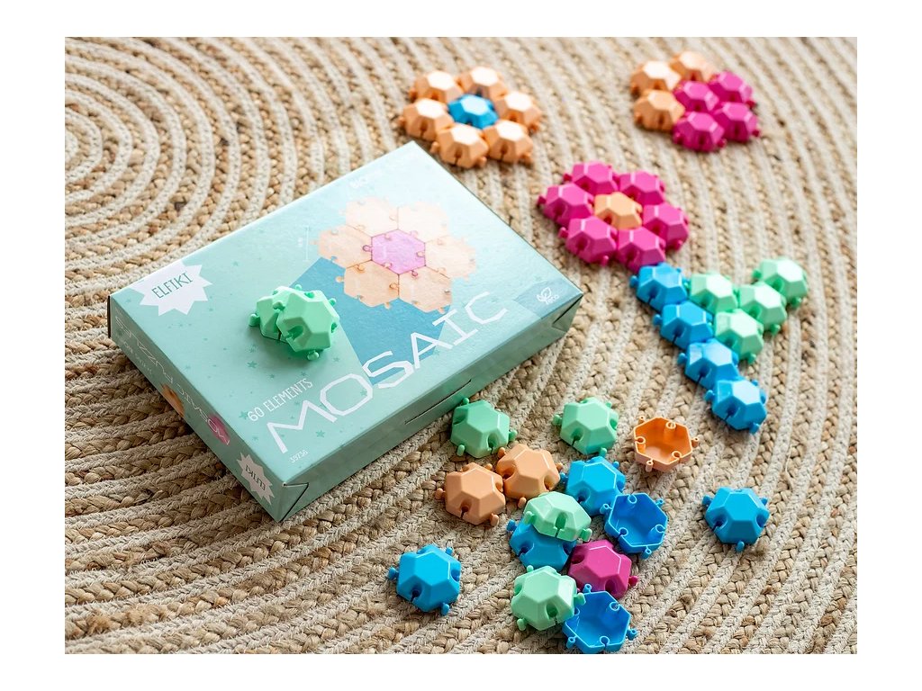 Mozaika ELFIKI je vzdělávací sada, která rozvíjí dětskou představivost a kreativitu. Sada obsahuje 60 pestrobarevných dílků. Pomocí speciálních spojovacích prvků mohou děti vytvářet různé obrazce: domy, stromy, květiny, zvířata a dokonce i 3D modely. Hra zároveň podporuje rozvoj jemné motoriky, zručnosti a trénuje pozornost dítěte.