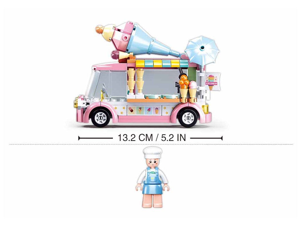 M38-B0993A Sluban Mobilní zmrzlinový stánek je krásná stavebnice ze série Girl's Dream. Náš zmrzlinář má svou dodávku plně vybavenou, aby mohl kdekoliv přijet a nabídnout nejen dětem z okolí lahodnou kopečkovou i točenou zmrzlinu. Vůz má po sestavení délku 13cm. Součástí stavebnice je jedna figurka, tištěný návod a nálepky.