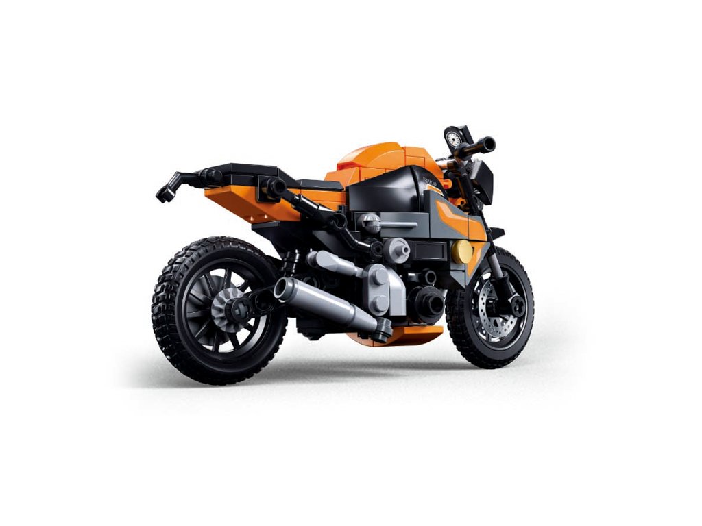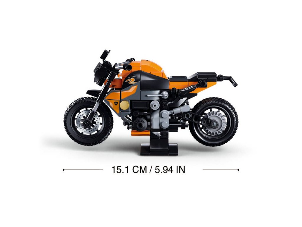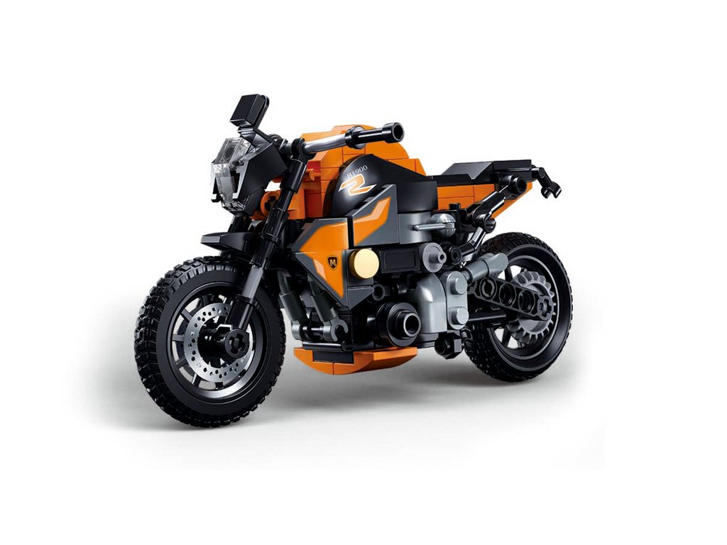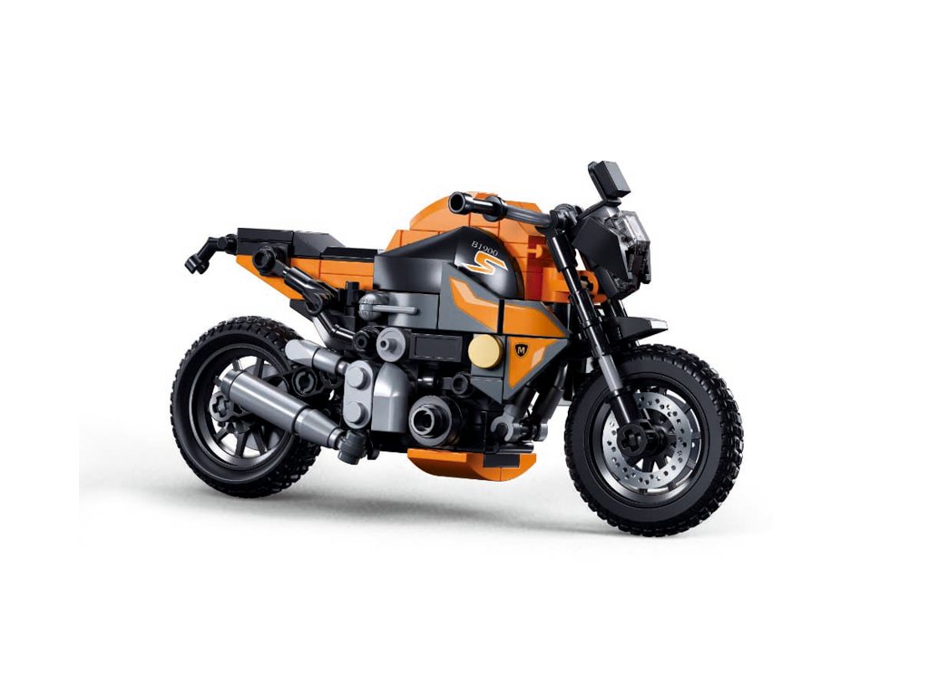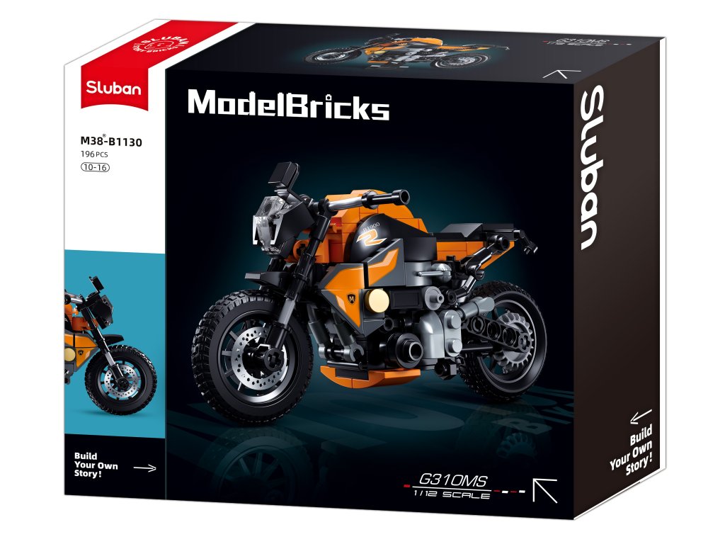 Stavebnice Sluban Model Bricks M38-B1130 přináší model motorky G310R v měřítku 1:12, který je jedním z šesti nových modelů motorek od Slubanu. Tento model se skládá z 196 dílků a po sestavení měří 15 cm na délku. Jeho oranžovo-černé barevné provedení a design věrně odráží tvar a styl originálního stroje.
