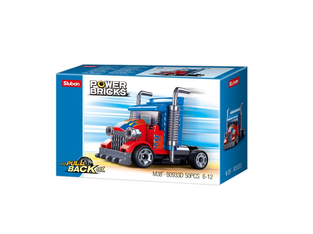 Natahovací autíčko tahače v modro-červených barvách ze série stavebnic Sluban Power Bricks. Stavebnice obsahuje 50 dílků, nálepky a tištěný návod.