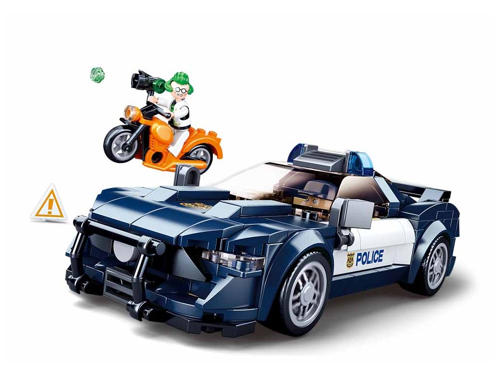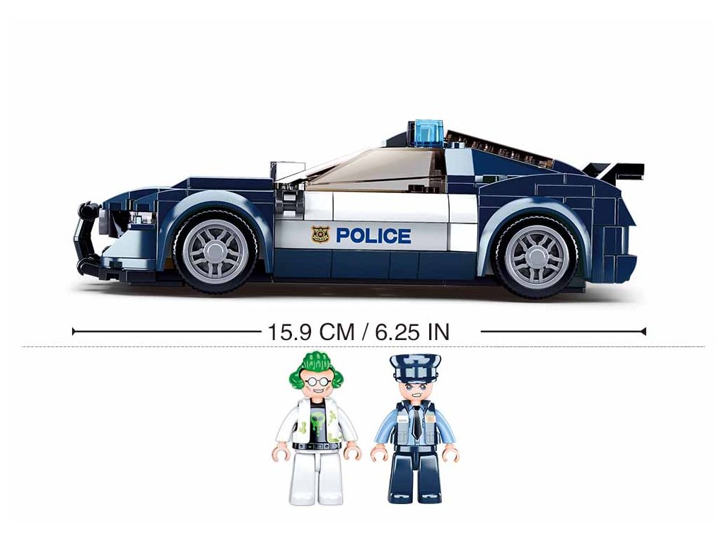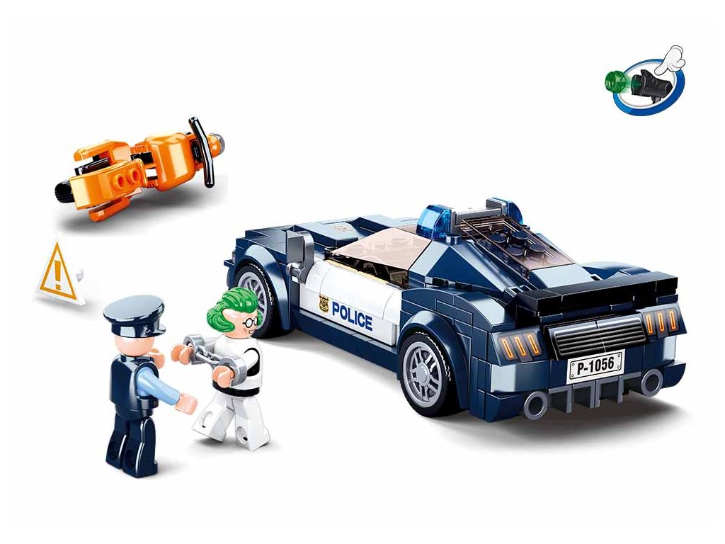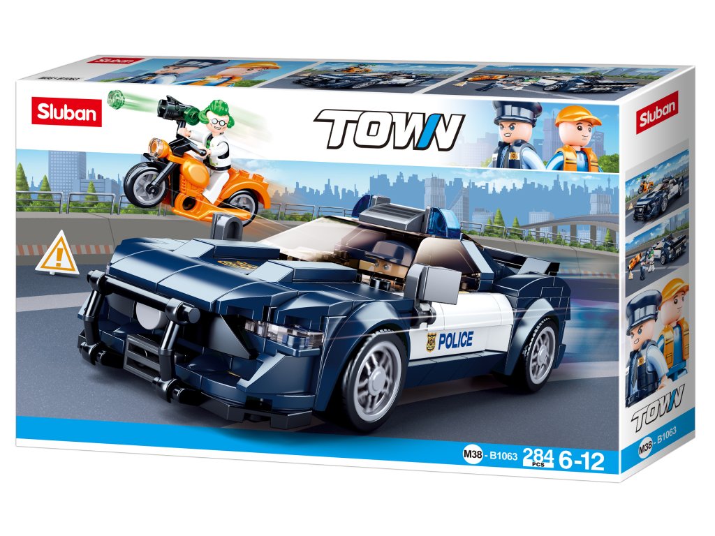 M38-B1063 Policejní sportovní vůz je stavebnice z kolekce Sluban Town. Policejní auto je po sestavení dlouhé téměř 16 cm. Součástí je i oranžová motorka se zlodějem a policista. Stavebnice je vhodná pro děti od 6 do 12 let.